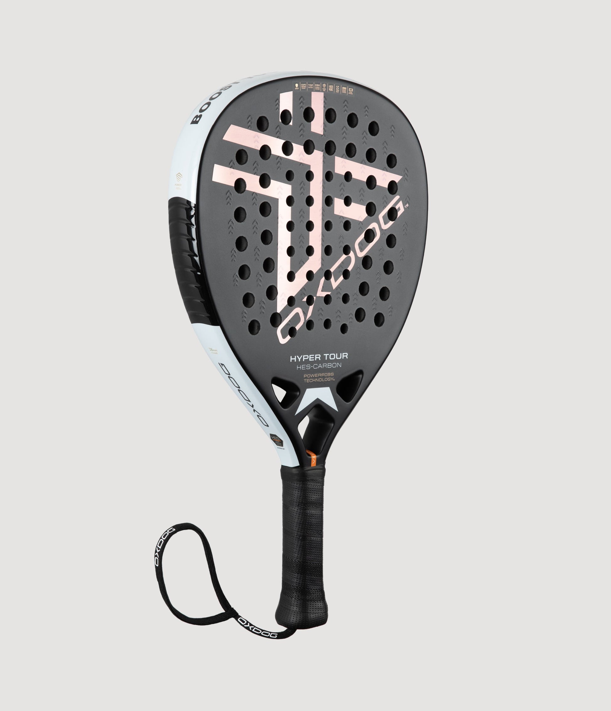 På toppen av rackhuvudet har Oxdog placerat sina PowerRibs, som ser till att du får mer slagkraft utan att behöva anstränga dig mer. Tekniken innebär att PowerRibs i kombination med Oxdogs High Energy System carbon överför kraften i ditt slag med högre hastighet.