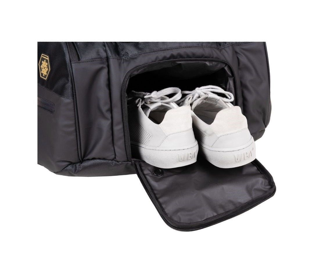 Snygg padelväska i svart med guldskrift från svenska Oxdog. Hyper Pro Thermo-väskan har plats för all din padelutrustning med separata fack för rack, kläder och skor. Dina rack skyddas av värmeisolering som håller temperaturen konstant, så att skummet i rackets kärna inte utsätts för onödiga temperatursvängningar. Dessutom har du ventilerade fack för skor och kläder, samt mindre fack för värdesaker och accessoarer.